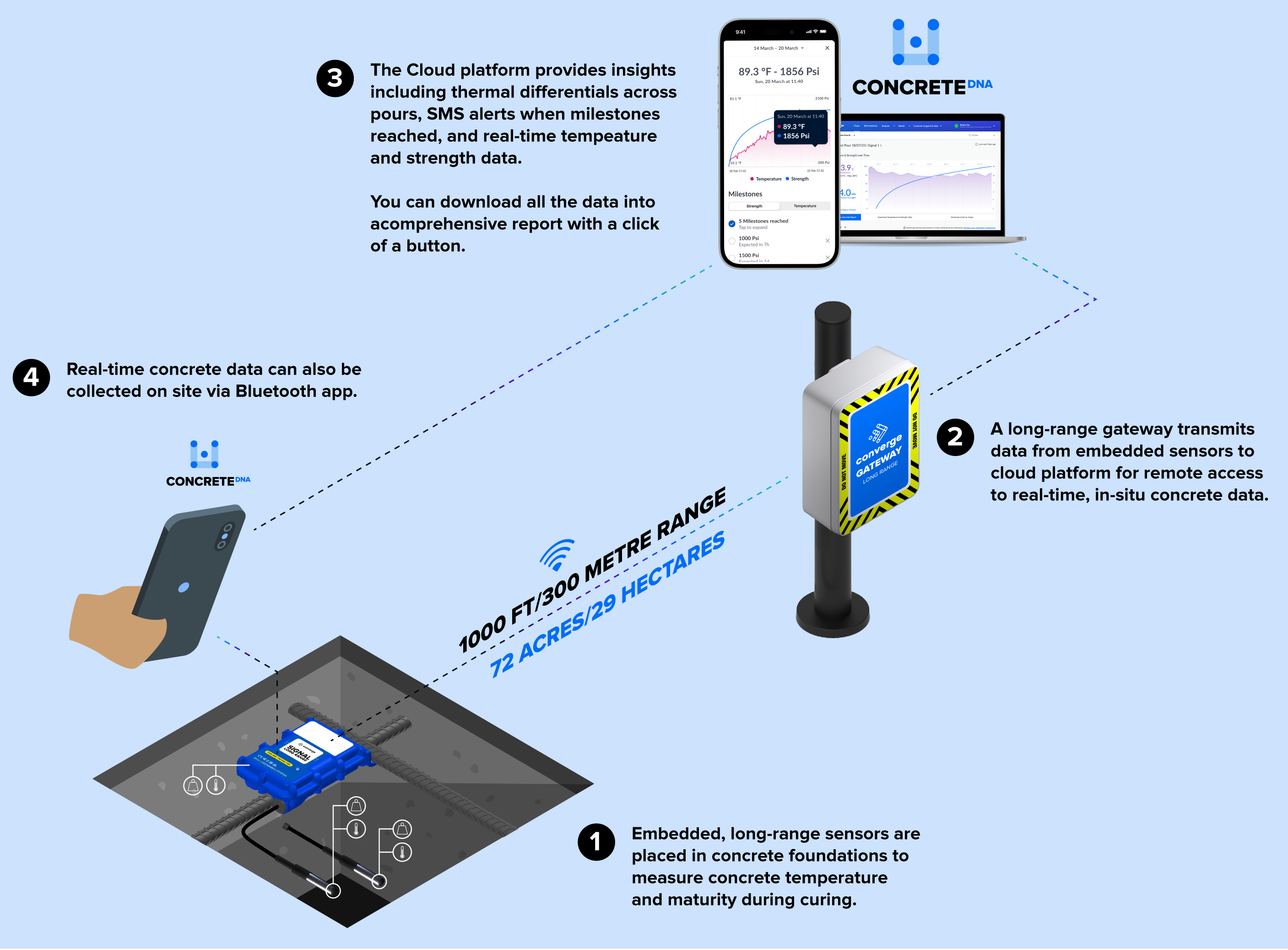 Converge launches Signal Long Range™, a revolutionary fully embedded sensor system delivering autonomous real-time concrete monitoring, with wireless range across up to 72 acres with a single gateway. Ideal for large-scale infrastructure projects, Signal Long Range™ integrates seamlessly with ConcreteDNA™ to drive faster, smarter, and more sustainable construction decisions.